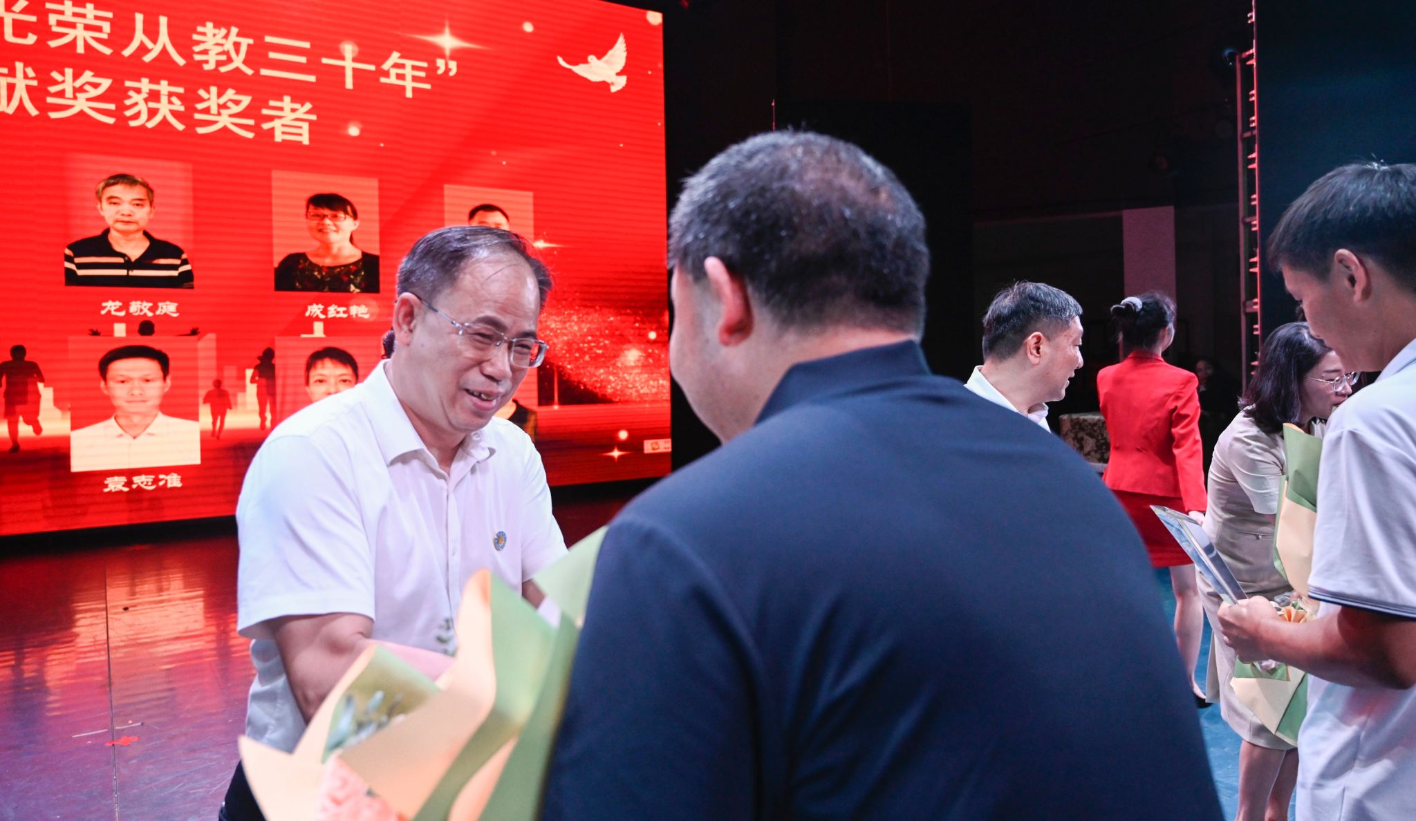 副校长谭献良先后宣读了《关于表彰2024年度单位目标管理考核先进集体及单项奖的决定》《关于表彰2025年师德先进个人的决定》《关于表彰时搏在线第41个教师节先进人物(团队)的决定》。组织部等10个部门获评2024年度单位目标管理考核先进集体,纪委/监察专员办公室等10个部门获2024年度单位目标管理考核单项奖。张莉等15位教师获师德先进个人,习胜丰等10位教师获“光荣从教三十年”奉献奖,王林飞等10位教师获最美教师,王平等20位教师获优秀教师,王玮等10位教师获优秀教育工作者,理学院数学建模与数学竞赛教育“灯塔团队”获优秀教育工作团队。
